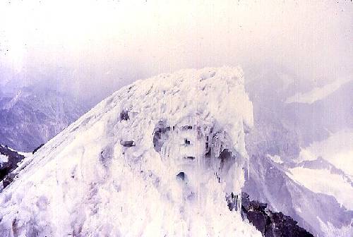 summit which was itself an unstable cornice of ice and snow. We were now