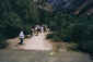 hewn wooden conduits past rocky buttresses and across side gullies until